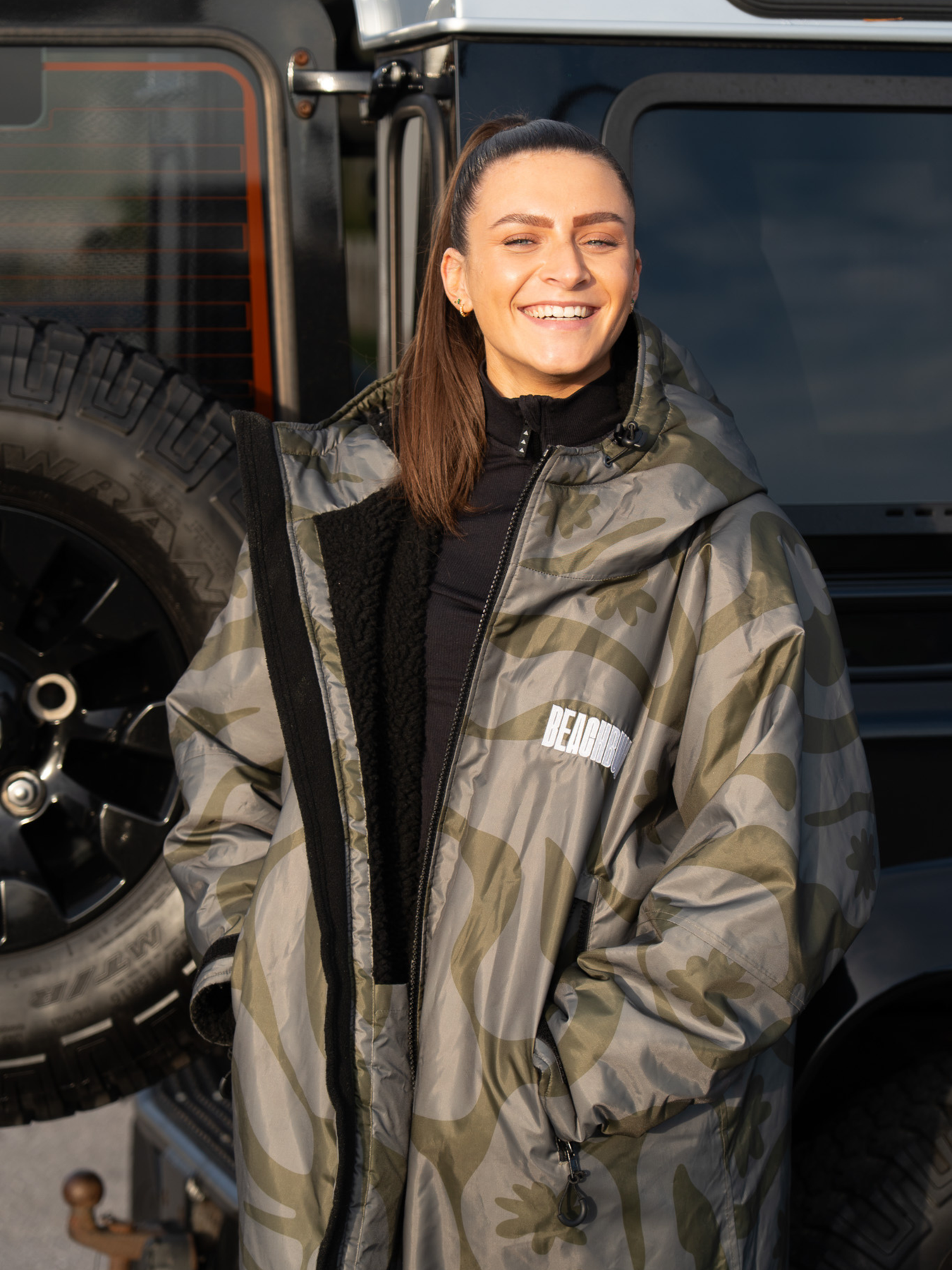 Very waterproof! The outside is 10k waterproof (which means it can holds up against 10,000mm of water per square inch. That is a lot of rain). But they’re also windproof, so it keeps rain and breeze off while you warm up. Plus, you’ve got the big hood, deep pockets and a cosy sherpa lining, so you’re all set for whatever the British weather throws at you.